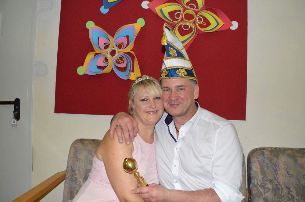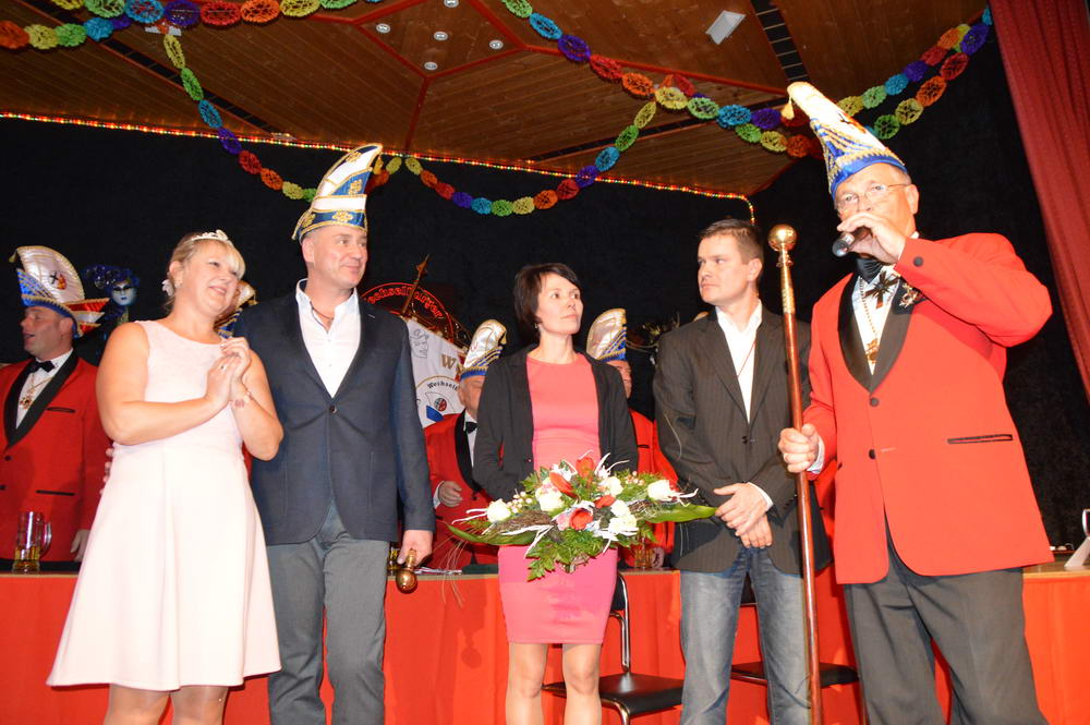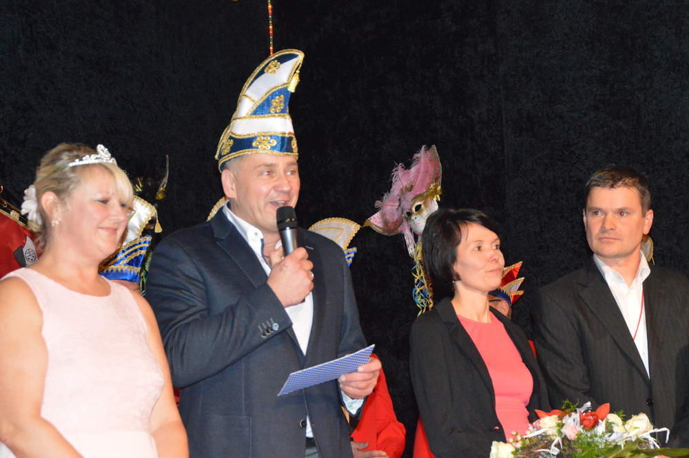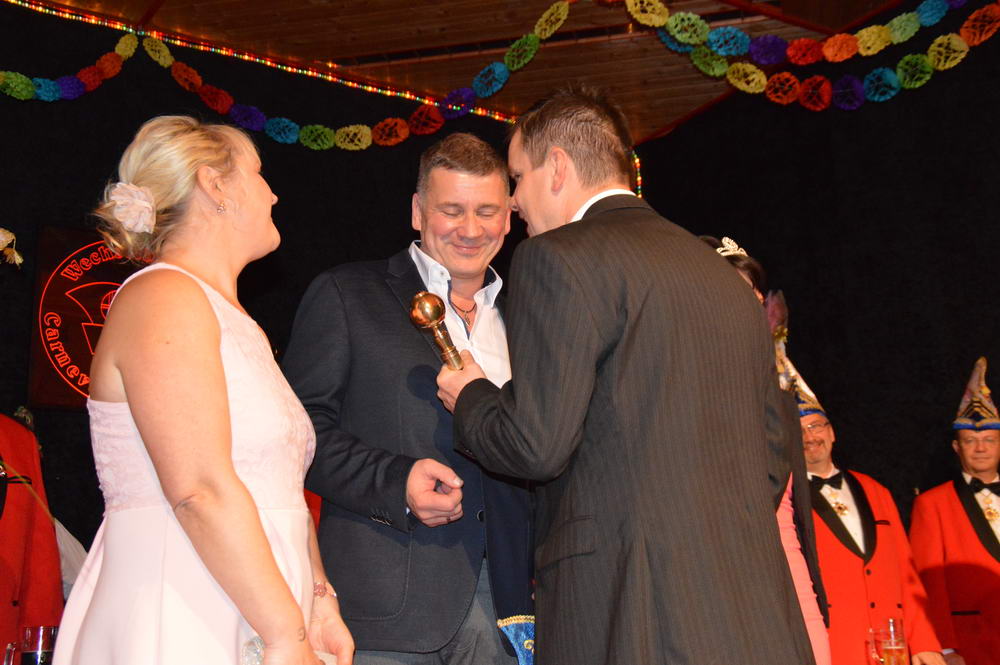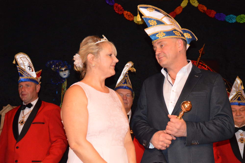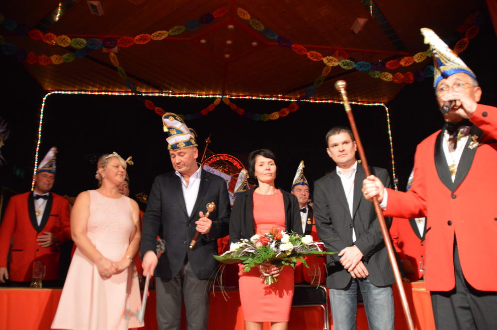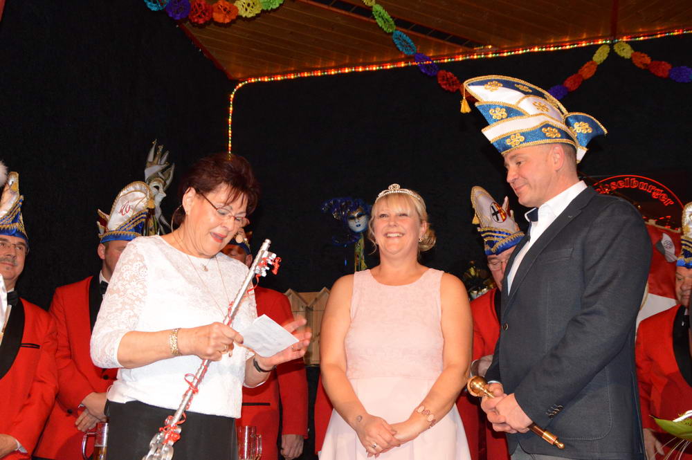 Zuerst einmal verabschiedete sich der Elferrat von unserem bisherigen Prinzenpaar. Dann erhielt das neue Prinzenpaar Zepter, Kappe und Krone und aus den Händen der Bürgermeisterin den Rathausschlüssel.  Damit ausgestattet werden sie uns als