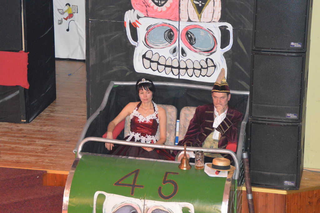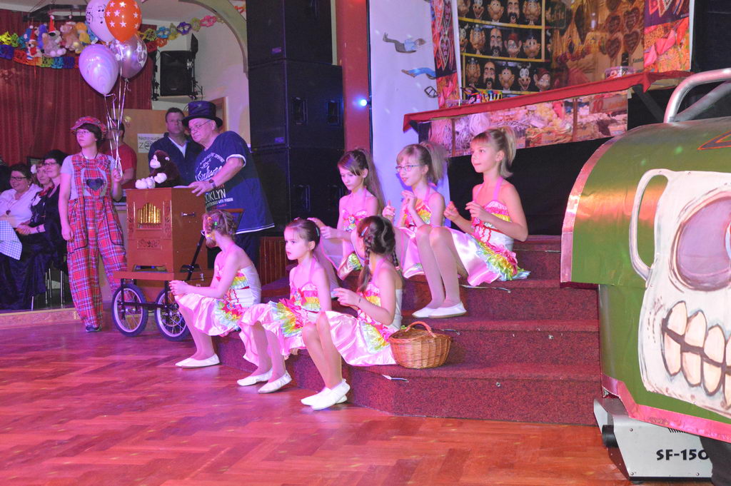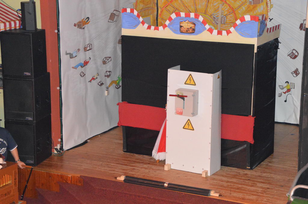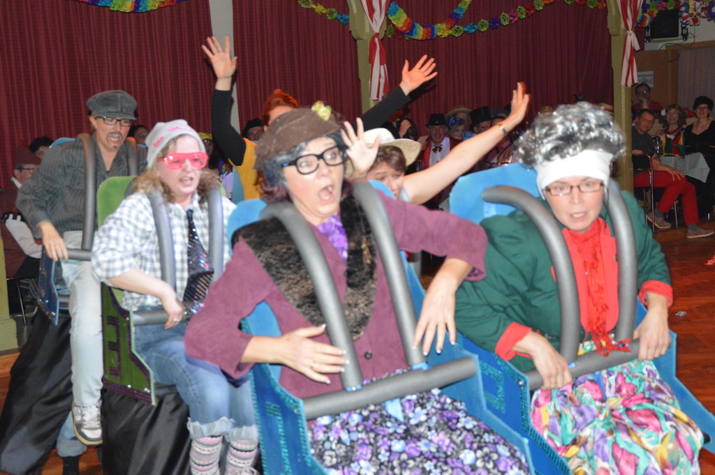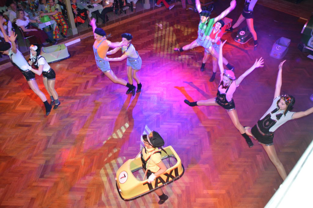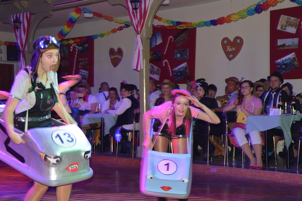 Gleich darauf brauste die Achterbahn des Jahrmarktes zu einer weiteren Runde durch den Saal. Die Mutter hatte allerdings auch diese Fahrt verpasst. Stattdessen hat sie erst einmal einen Zwischenstopp beim Autoscooter gemacht. Wie bei den Fahrgeschäften üblich, ertönt dabei ständig die verschiedenste Musik. Dazu tanzte die Funkengarde in ihren Autoscooter-Fahrzeugen.