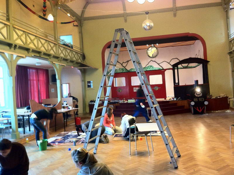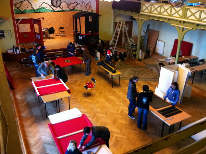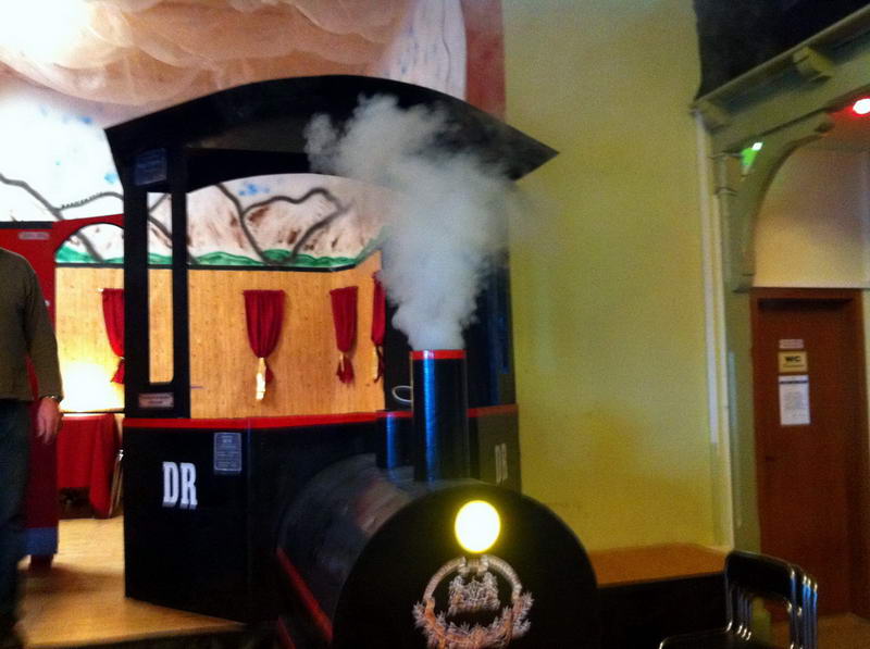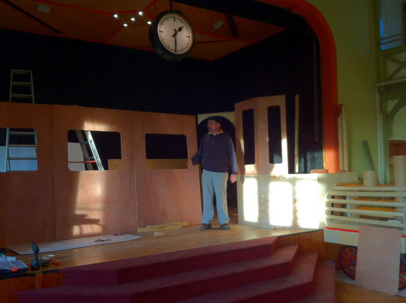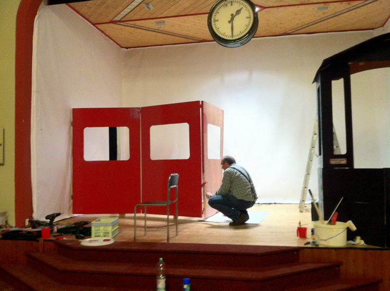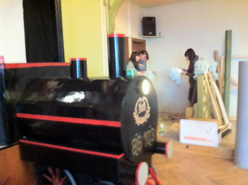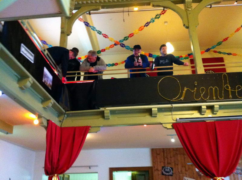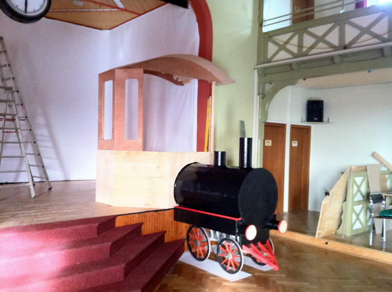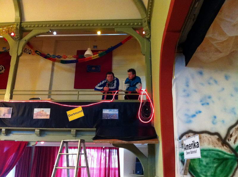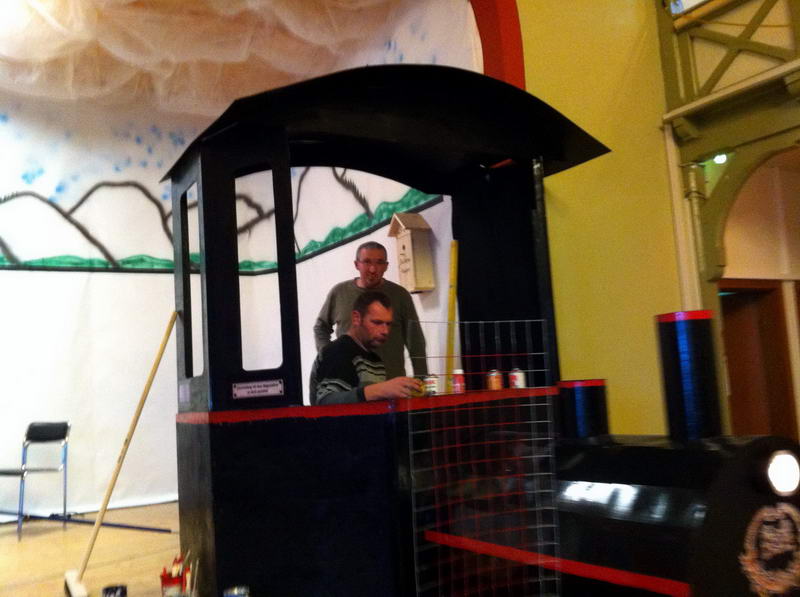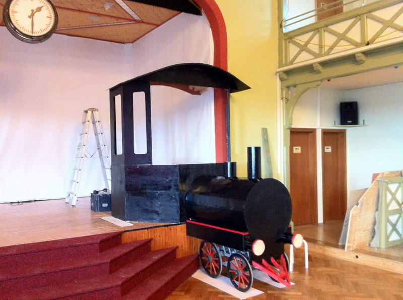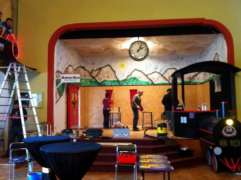 Dem Saalaufbau vorangegangen war die Arbeit der "Gruppe Bühne". Hier wurde in mindestens genau so vielen Mannstunden wie beim Saalaufbau - allerdings mit viel weniger Leuten - die Bühne in einen zünftigen Orientexpress verwandelt. Der absolute Hingucker (auf Neudeutsch sagt man jetzt wohl Eigädscher dazu) ist dabei sicherlich die Prinzenloge in Form einer Dampflokomotive.