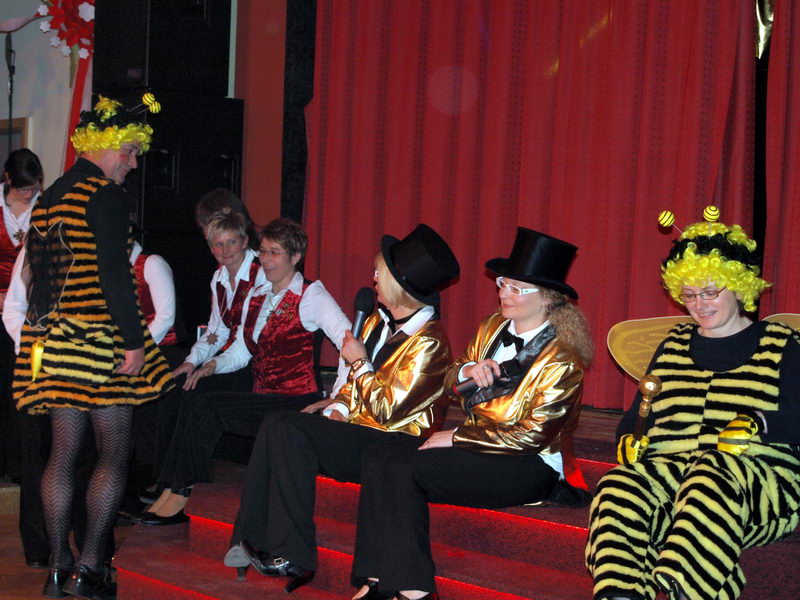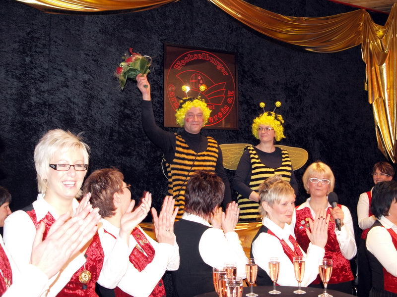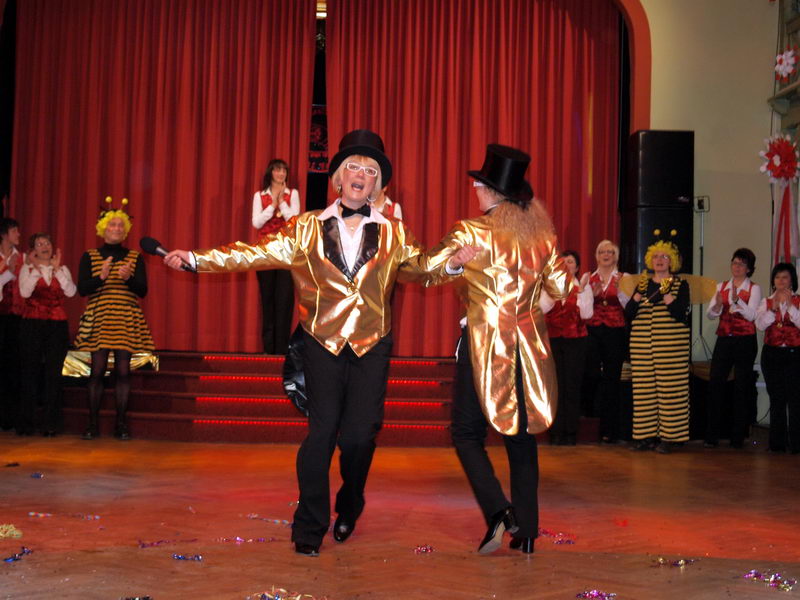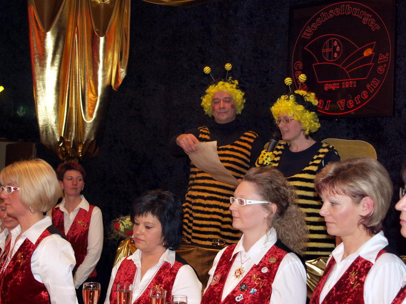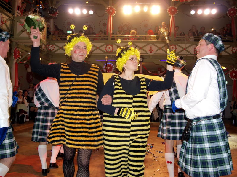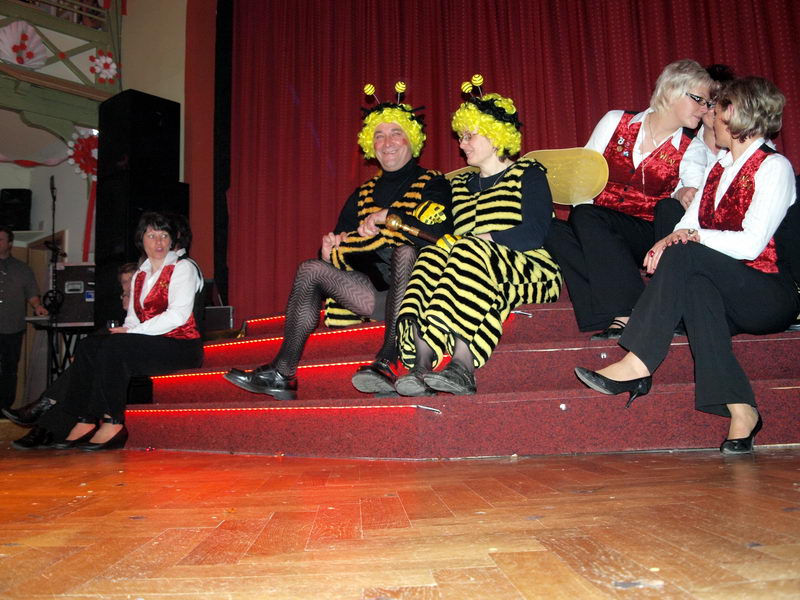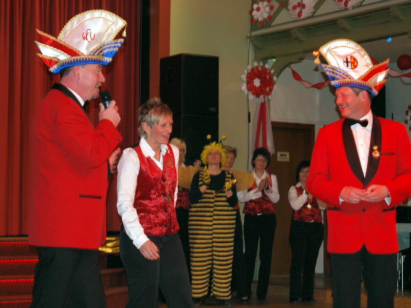 Wie Bereits in den vergangenen sechs Weiberfaschingsveranstaltungen trat das Prinzenpaar mit vertauschten Rollen auf. Also, Prinz Jörg als Frau und Prinzessin Silvia als Mann. Sie residierten an diesem Abend - als Bienen verkleidet - als