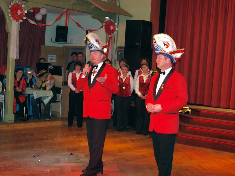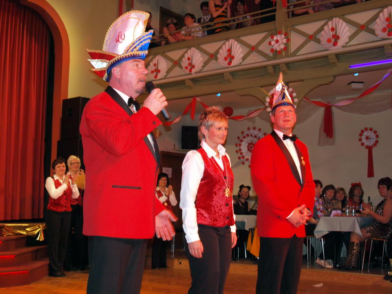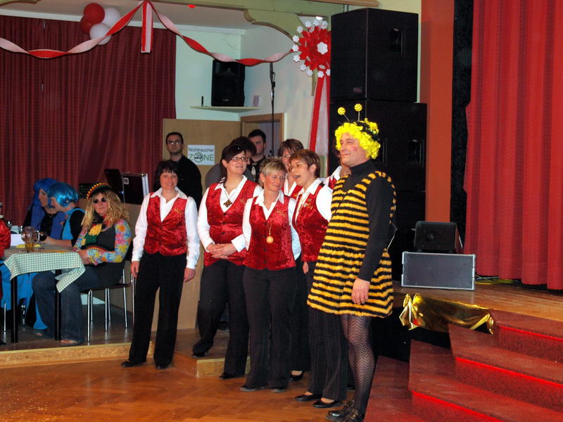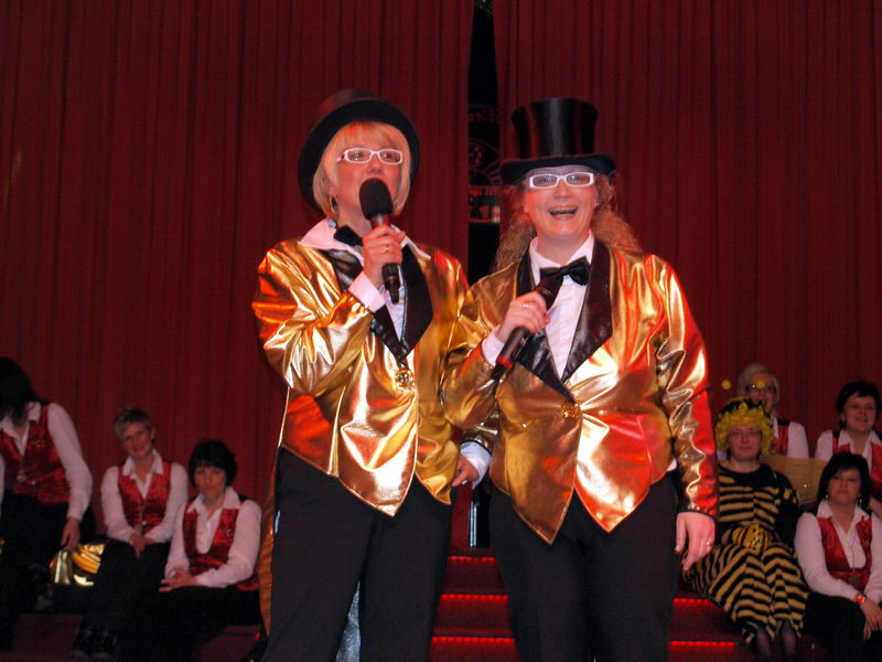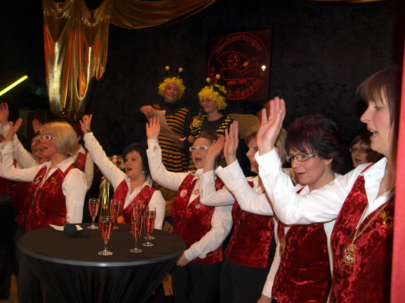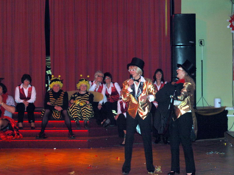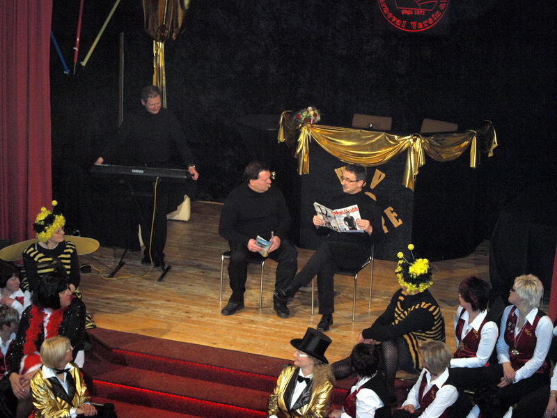 Wie Bereits in den vergangenen sechs Weiberfaschingsveranstaltungen trat das Prinzenpaar mit vertauschten Rollen auf. Also, Prinz Jörg als Frau und Prinzessin Silvia als Mann. Sie residierten an diesem Abend - als Bienen verkleidet - als
