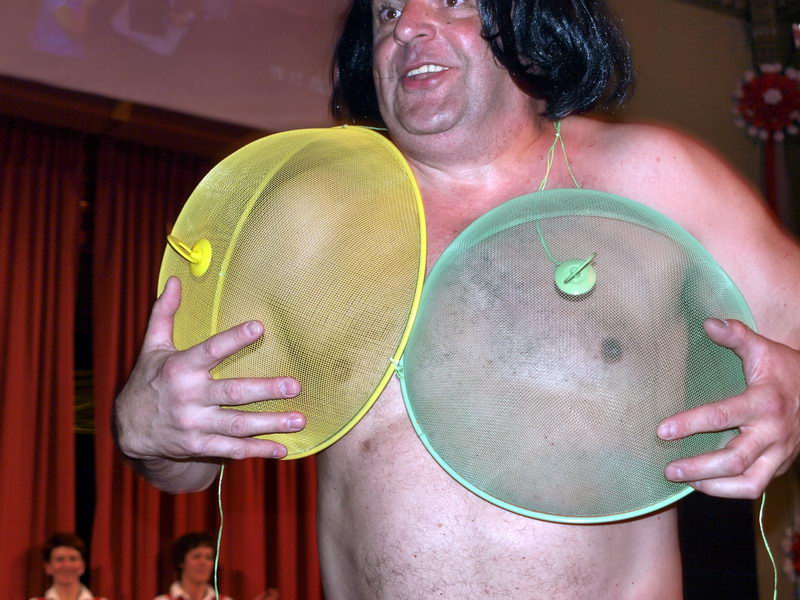 Nach dem Auszeichnungsakt ging es dann aber weiter im Programm des Weiberfaschings. Während Mandy und Karina ein Gespräch führen, kommt "Kieselsteinchen" (Gerd Wagner) mit einem Bauchladen voller BH's in den Saal. Was wollte er uns damit sagen? Richtig, es geht um irgend etwas mit Busengrößen bzw. den BH-Größen. In einem Gedicht über selbige ging es von der kleinsten Körbchengröße "0" bis hin zur Körbchengröße "12" (Eschenbach-Zelt). Und zu jeder Körbchengröße kam "Kieselsteinchen" in den Saal und demonstrierte diese am eigenen Körper. Angefangen von kleinen Erbsen über diverse andere Gemüsesorten bis hin zu zwei riesigen Sieben.