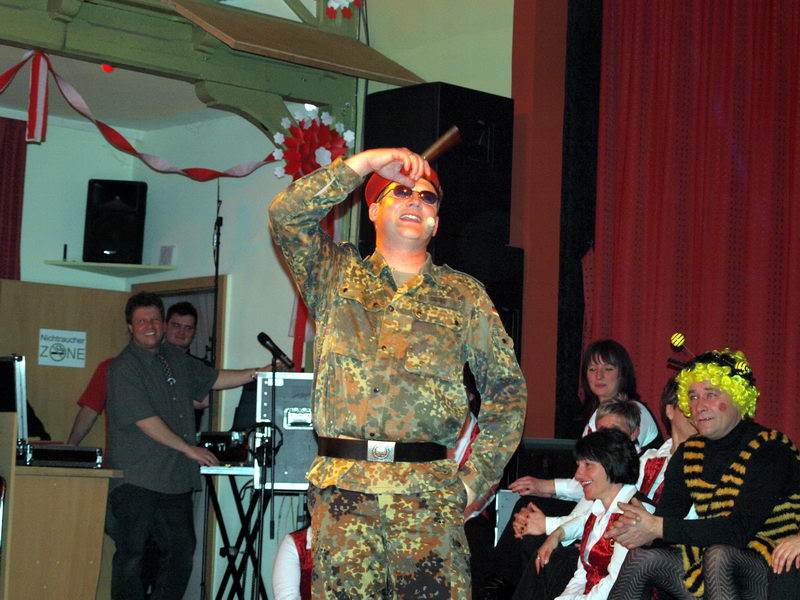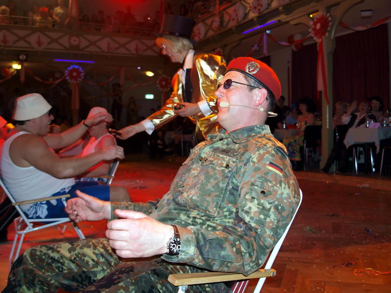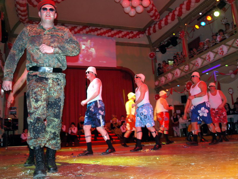 Nach einer weiteren Pause trat dann noch einmal das Männerballett - jetzt nicht mehr im Schottenkostüm - auf. Im Zuge der Abschaffung der Wehrpflicht übernahm Ausbilder Schmitz (Sven Benndorf) die Sache in die eigenen Hände und trainierte eine Truppe von Kleingärtnern. - Auf, dass diese bereit werden zur Verteidigung der heimatlichen Gärten.
