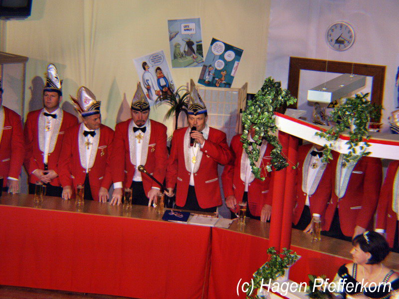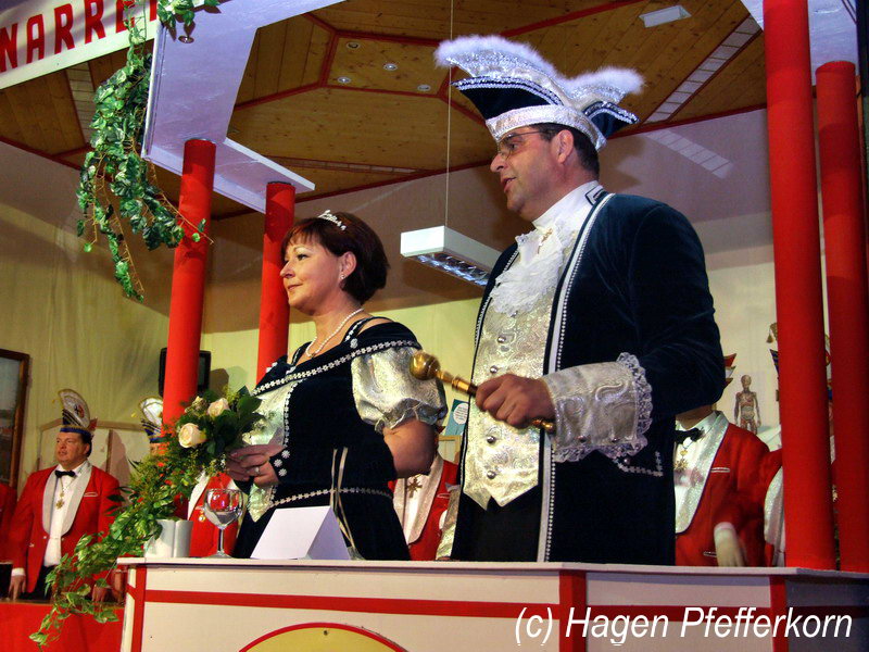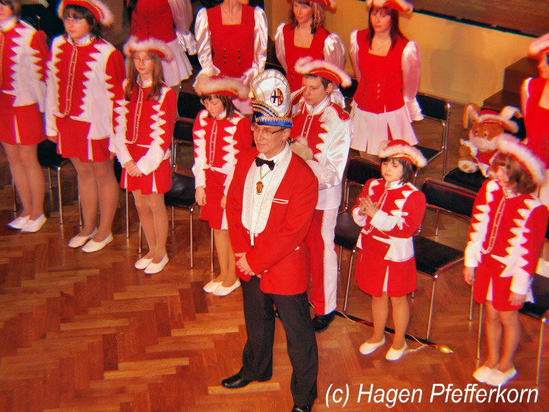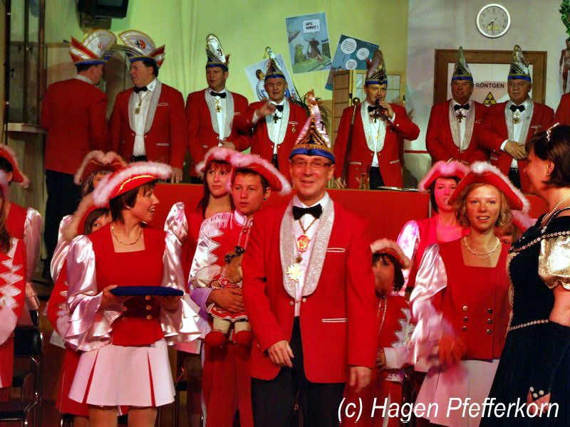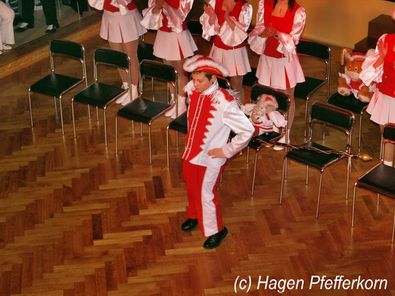 Doch bevor die Narren in der Klinik die Oberhand gewinnen konnten, ging es erst einmal um die sogenannten ernsten Dinge des Faschings in Wechselburg. Pünktlich um 19.11 Uhr zog die Prinzengarde des WCV unter den Klängen ihres Gardemarsches in den Saal ein und bildete dann das Spalier für den Einzug des Elferrates und des Prinzenpaares der 39. Saison, Prinz Gerd I. und Prinzessin Manuela II. Der Kontrast konnte in diesem Jahr nicht größer sein: Am Ende des Elferrates läuft unser kleinstes Elferratsmitglied und wird gefolgt vom Prinzen, der ihn mit knapp zwei Meter gleich um mehrere Kopflängen überragt. Vervollständigt werden die Akteure des offiziellen Teiles der Faschingsveranstaltungen beim WCV durch die Nachwuchsprinzengarde, die mit Ihrem neuen Marsch in den Saal einzogen.
