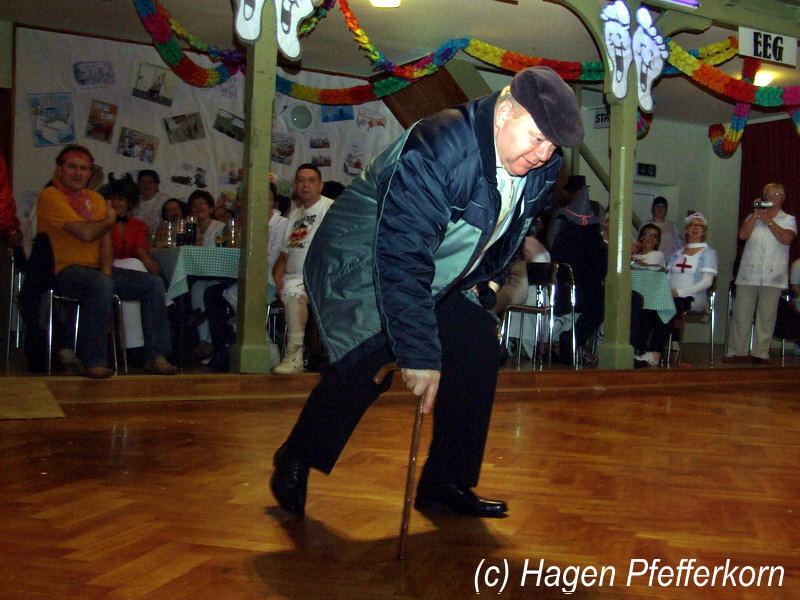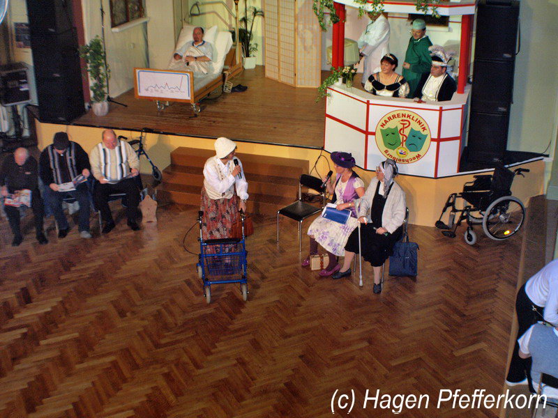 Oberschwester Elfriede (David Meliczek) begann ihre/seine Tagschicht, ohne zu ahnen, was so im Laufe des Tages alles auf sie/ihn zukommen wird. Zuerst einmal füllte sich wie jeden Morgen der Wartesaal der Praxis der Narrenklinik mit lauter Rentnern, die das Wartezimmer als sozialen Treffpunkt und zum Austausch des neuesten Klatsch und Tratsch benutzen. Während sich Günter und Günter (Günter Meinhold und Günter Winkler) noch über ihre aktuellen Leiden austauschten, kam Ihr Kumpel Reiner (Reiner Thiele) in arg gebückter Haltung in das Wartezimmer. Mitfühlend nach seinem Leiden gefragt, antwortete dieser, dass es ihm eigentlich sehr gut gehe. Nur der Stock war zu kurz (nur ca. 50 cm lang!!).