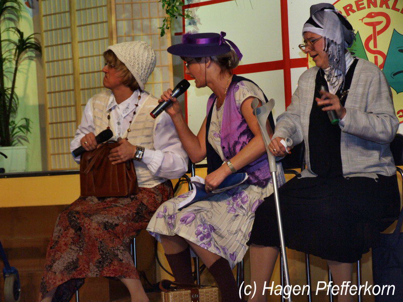 Inzwischen ging das Getratsche im Wartezimmer weiter. Doch waren es jetzt die älteren Damen Traudel (Kathrin Pfefferkorn) und Erna (Gabi Vollstädt), die ihre Alterskameradin Paula (Karina Baronius) im Wartezimmer begrüßten. Und sofort ging das Palavern über alle möglichen Krankheiten und deren Behandlungsmöglichkeiten los. Zum Beispiel: