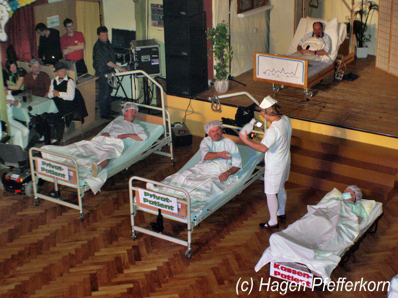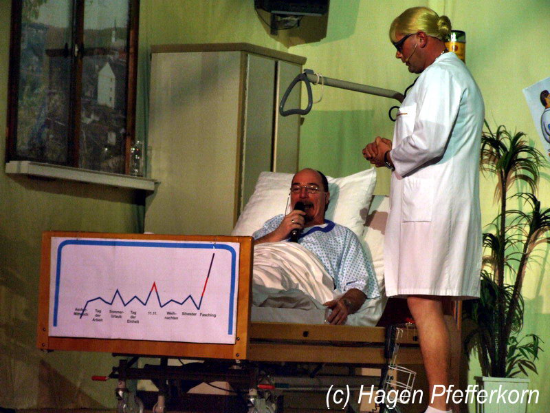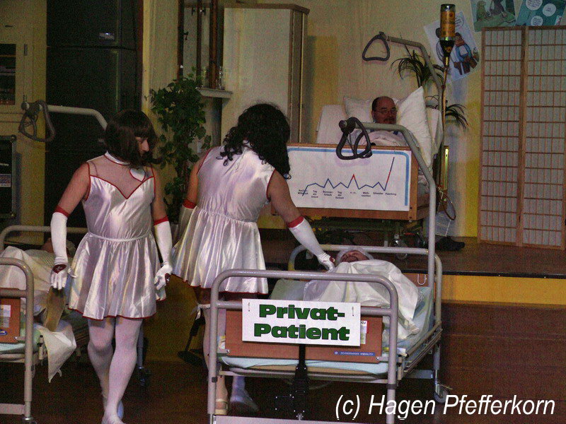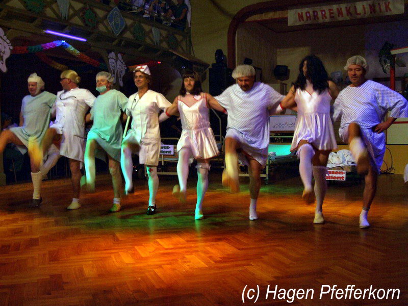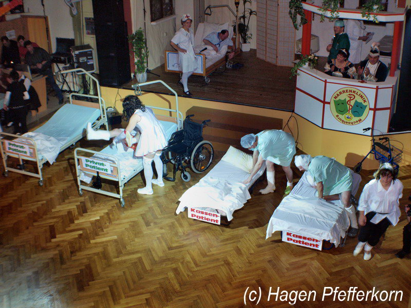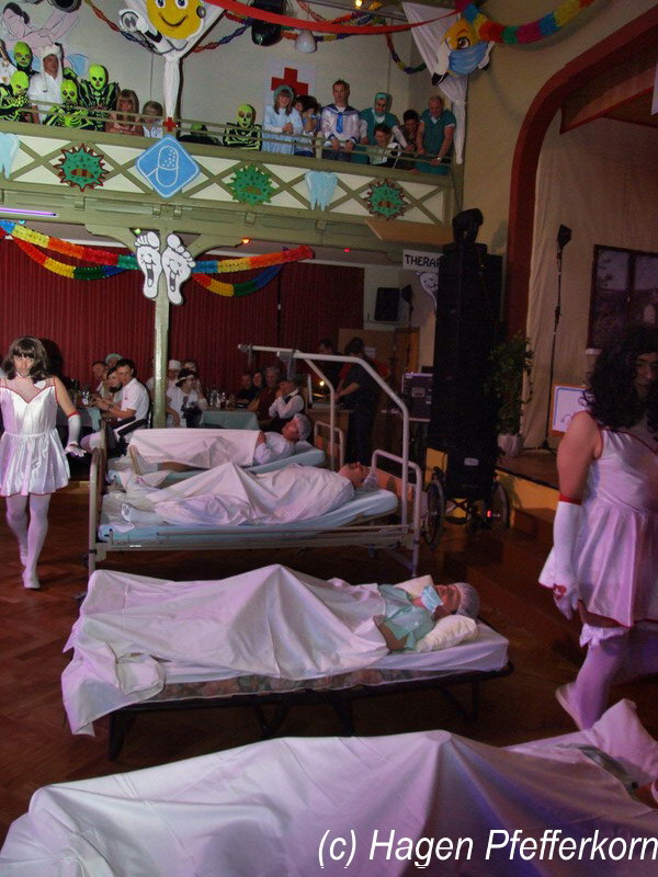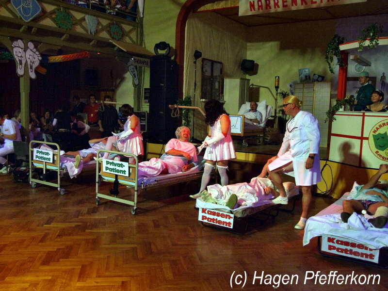 Inzwischen ist es Abend geworden in der Narrenklinik und Oberschwester Elfriede übergibt an die Nachtschwester (Andreas Vollstädt). Dabei erhält das närrische Publikum erst einmal einen Einblick in unser aktuelles Gesundheitssystem: Privatpatienten werden in ihren luxuriösen Betten ständig von Krankenschwestern umsorgt, während die Kassenpatienten in einfachsten Betten auf sich allein gestellt sind. Doch irgendwann finden alle Patienten - egal ob Kassen- oder Privatpatient - zueinander. Nämlich in der Forderung nach sexy Krankenschwestern („Ich will nur ein schneeweißes Luder“). Beim diesem Auftritt des Männerballetts gab es vom Publikum die ersten "Zugaben"-Rufe.
