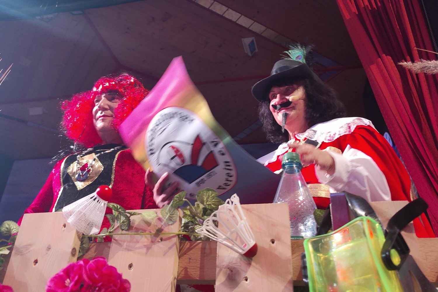 Den Auftakt machte wieder unsere Schottengarde vom Männerballett, die dann auch den weiblichen Elferrat und das Prinzenpaar in den Saal geleiteten. Traditionell kam das Prinzenpaar mit vertauschten Rollen in den Saal. Günter Liebing war als Gundula I. eine wunderschöne Prinzessin und Andrea Liebing trat als Prinz Andreas I. auf. Beide waren kostümiert als Musketiere. Andreas I. verlas dann auch erst einmal die Regeln, an die sich alle Närrinnen im Saal zu halten hatten.