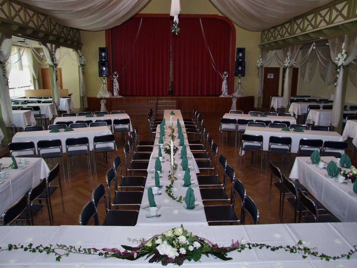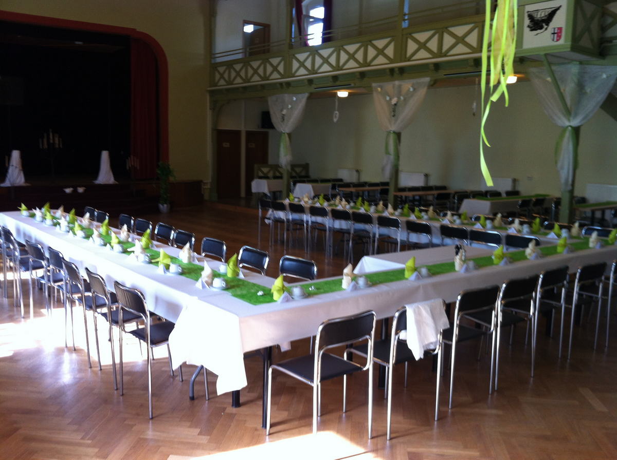 In der Vorbereitung darauf hatten eine ganze Reihe der Vereinsmitglieder in vielen fleißigen Stunden erste Verschönerungsarbeiten vorgenommen. Die Bühne wurde mit Holztäfelungen in einen sehenswerten Zustand versetzt, der gesamte Innenraum wurde einer gründlichen Reinigung unterzogen, und, und, und. Für das Wohlbefinden der Gäste wurden – vorfinanziert durch den Verein – 160 neue Stühle angeschafft. Und nicht zuletzt hat die gelungene Dekoration durch das Team vom Partyservice Dietmar Friedemann mit dazu beigetragen, dass sich der Saal den Gästen in einem völlig neuem Outfit präsentierte.