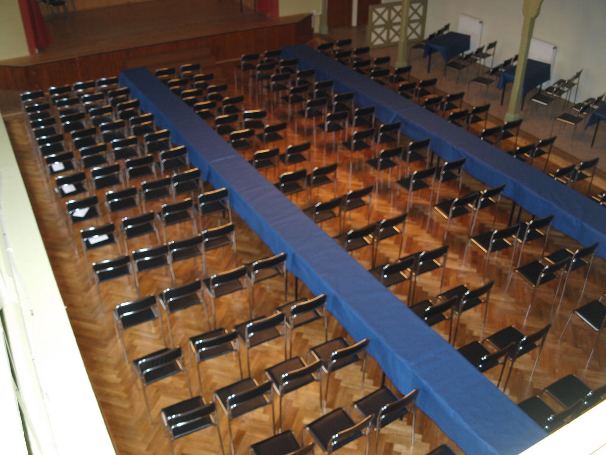 - Es wurden neue Vorhänge für die Fenster angeschafft. Aus dem gleichen Material wurde auch ein Bühnenvorhang angeschafft.